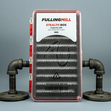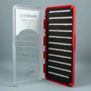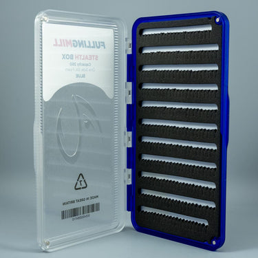 The Fulling Mill Stealth Box is a premium fly fishing storage box designed for serious anglers. It features a slender waterproof case with a secure clip closure. Inside, dense foam strips hold flies firmly in place, protecting delicate materials and hook points. The box is sized to fit comfortably in shirt or vest pockets while maximizing storage space.